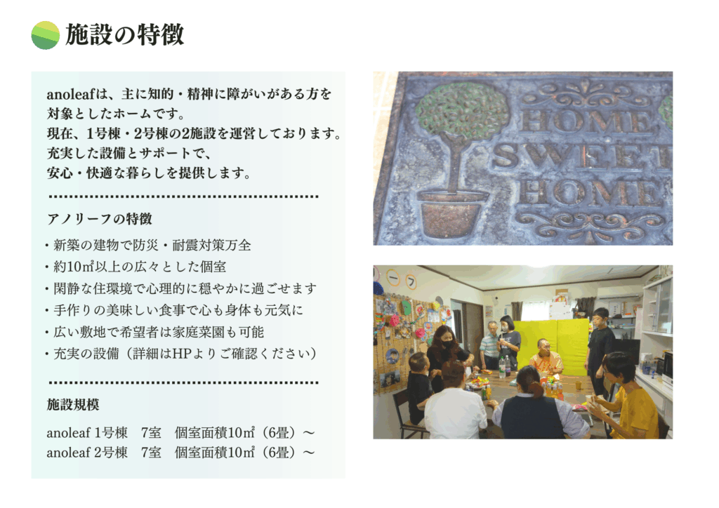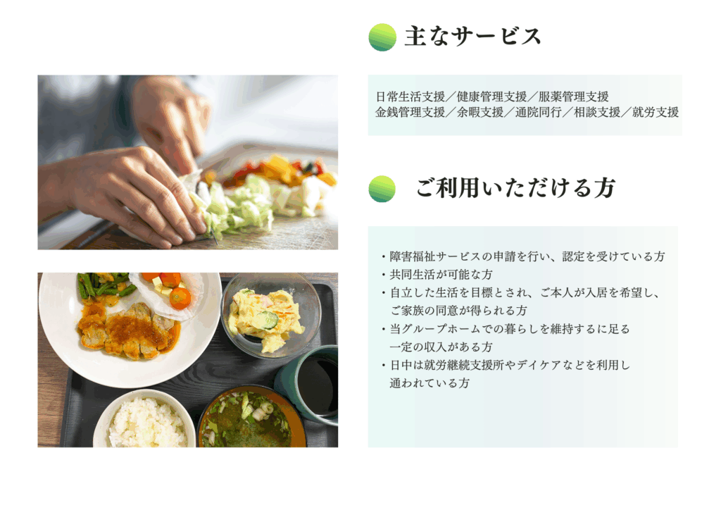 世話人さんなどから生活や健康管理面でのサポートを受けながら、共同生活を営む場所になります。